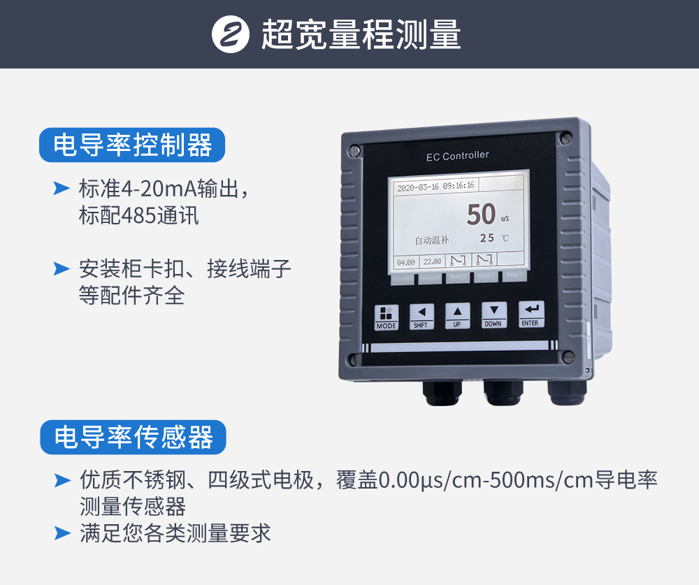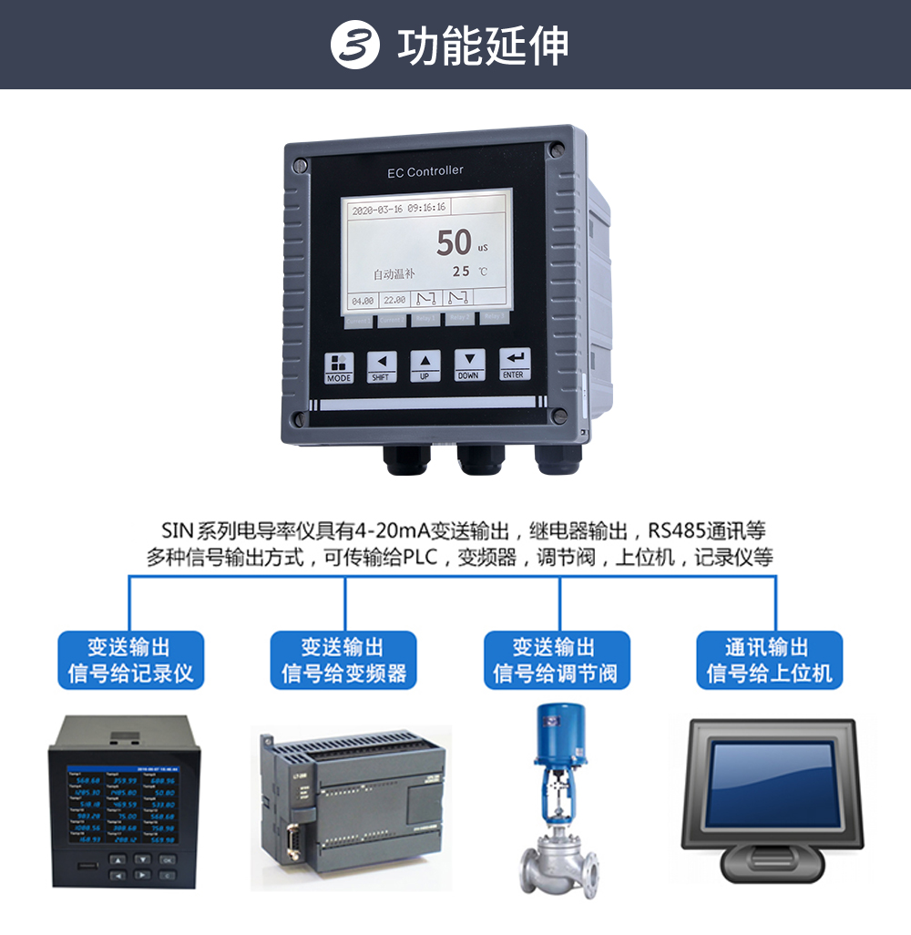 儀器用于工業(yè)上電導(dǎo)/比電阻/鹽度/溶解固體總量及溫度的測量,如: 廢水,純凈水,高純水,環(huán)境監(jiān)測,食品生產(chǎn)過程等,儀器可以盤面安 裝,壁掛安裝,管路安裝。儀器提供 2 路電流輸出,最大負(fù)載為 500Ω, 儀器提供 3 路控制用繼電器,繼電器最大承受電壓及電流為 5A/250VAC 或 5A/30VDC。
