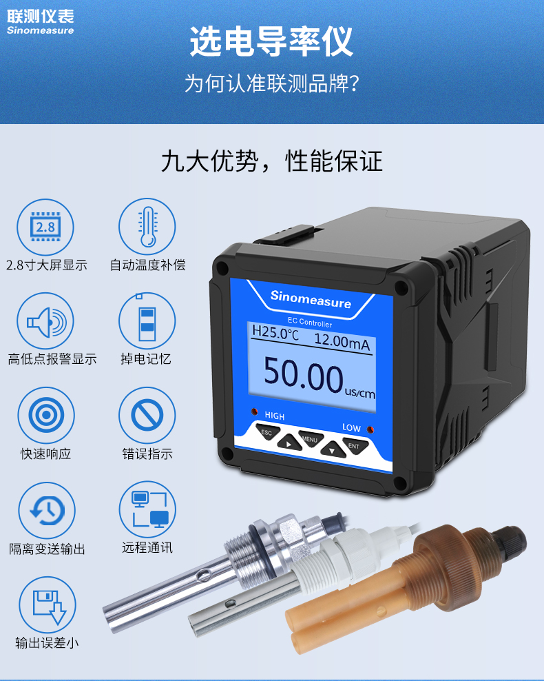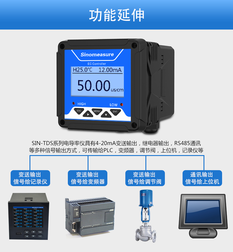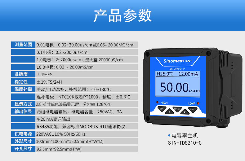 SIN-TDS210-C工業電導率儀表,廣泛應用于火電、化工化肥、冶金、環保、制藥、生 化、食品和自來水等行業。控制器主要對溶液中的電導率/總溶解固體/ 電阻率和溫度進行連續監測。