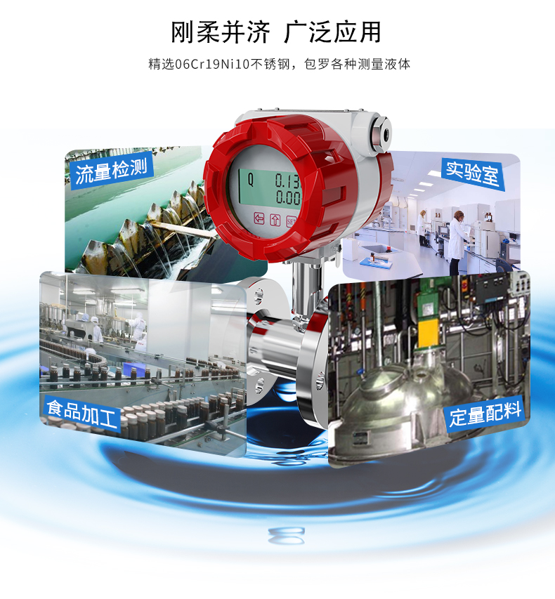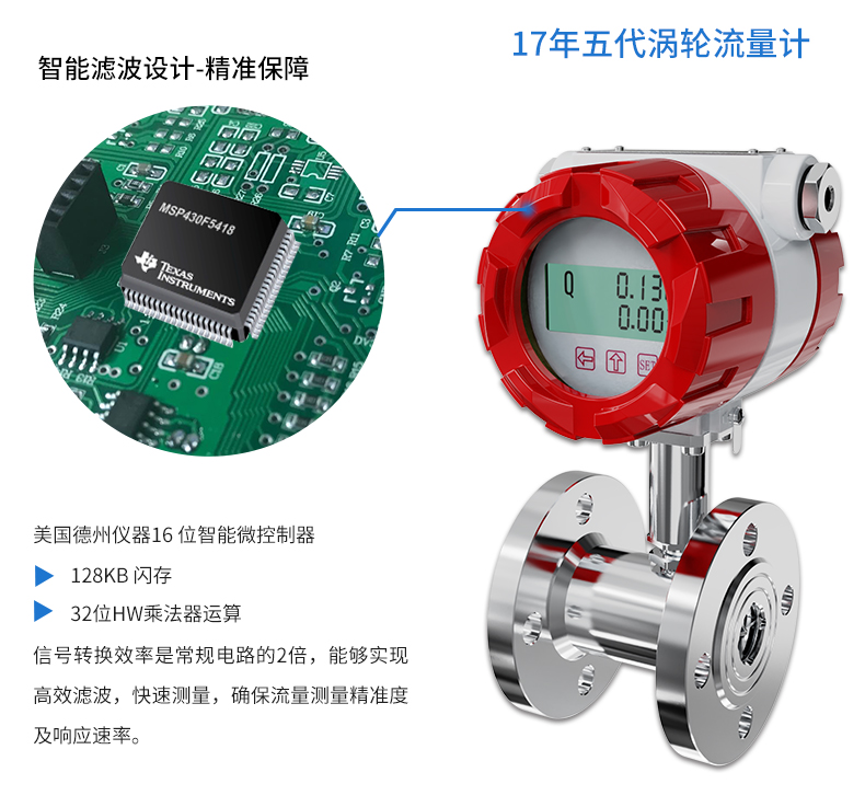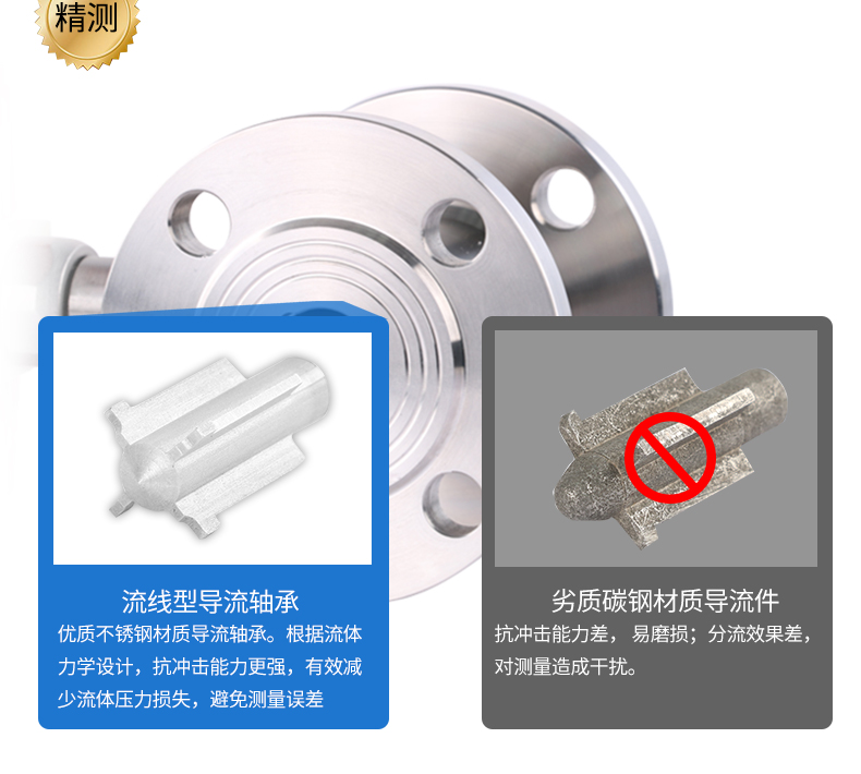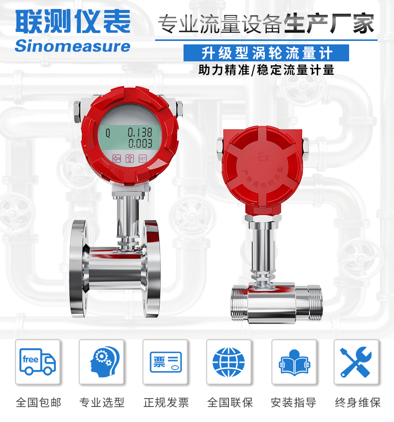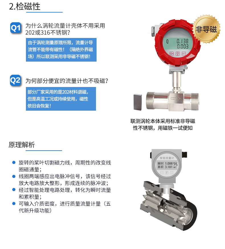 流體流經傳感器殼體,由于葉輪的葉片與流向有一定的角度,流體的沖力使葉片具有轉動力矩,克服摩擦力矩和流體阻力之后葉片旋轉,在力矩平衡后轉速穩定,在一定的條件下,轉速與流速成正比,由于葉片有導磁性,它處于信號檢測器(由永久磁鋼和線圈組成)的磁場中,旋轉的葉片切割磁力線,周期性的改變著線圈的磁通量,從而使線圈兩端感應出電脈沖信號,此信號經過放大器的放大整形,形成有一定幅度的連續的矩形脈沖波,可遠傳至顯示儀表,顯示出流體的瞬時流量或總量。
