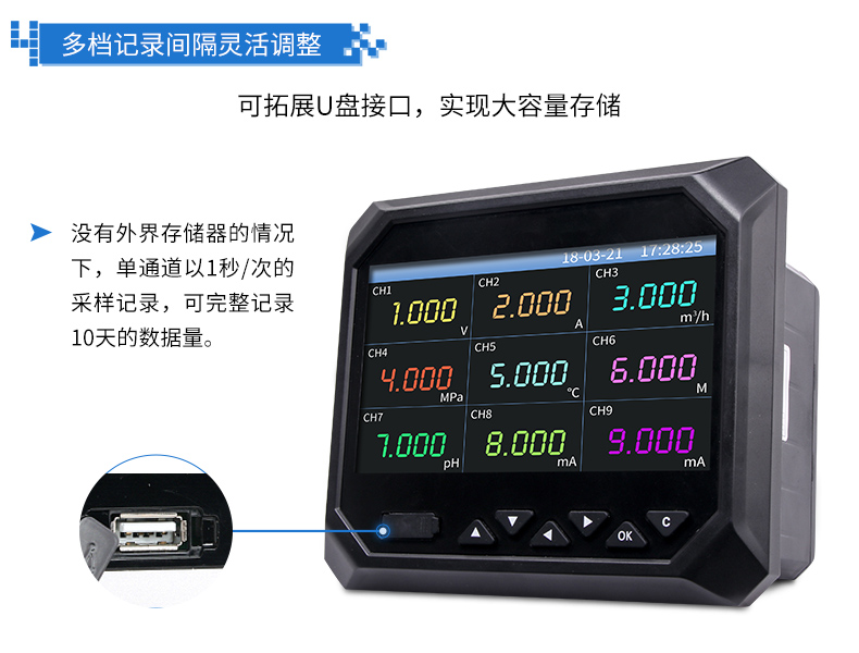 無紙記錄儀是將采集的數據/運算數據以時間為基軸記錄在儀器內部的存儲系統中,無消耗任何常用的記錄設施,如:紙張、筆墨。記錄在儀器內部的存儲數據,通過運算、模擬后顯示在液晶屏。常用顯示用液晶屏比較廣泛。在液晶屏屏幕上,可以顯示數字顯示、棒圖顯示、曲線顯示、報警列表等。無紙記錄儀采集的數據,常用的有:溫度、壓力、流量、液位、電壓、電流、濕度、頻率、振動、轉速等。