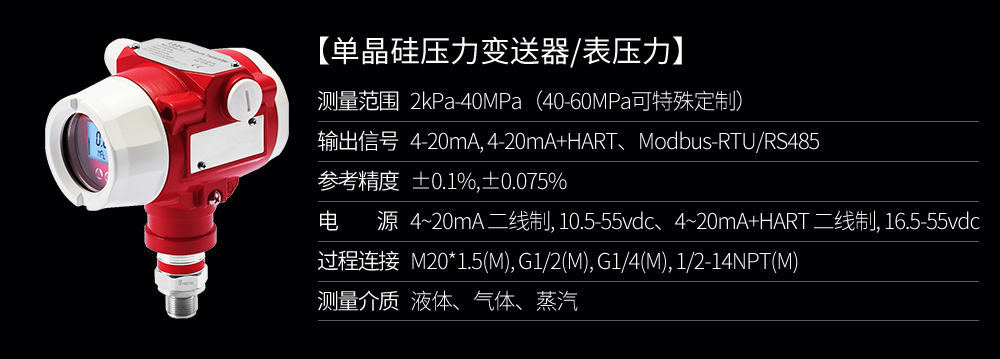 單晶硅壓力變送器用于測量液體、氣體或蒸汽的液位、密度、壓力,然后將其轉變成4-20mAHART電流信號輸出