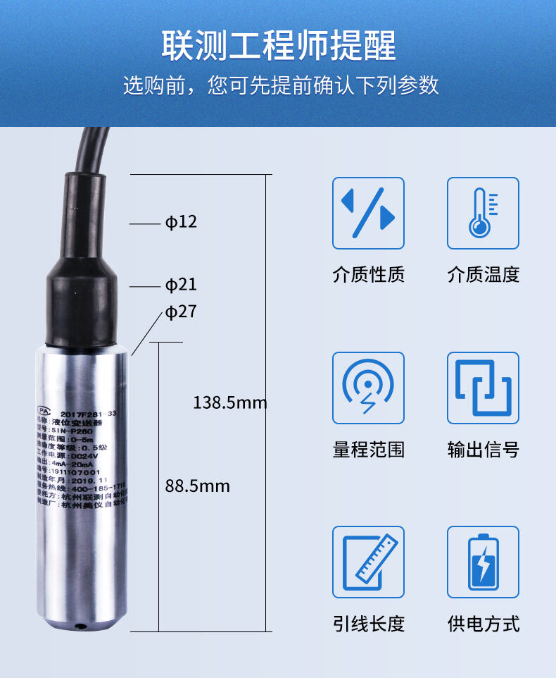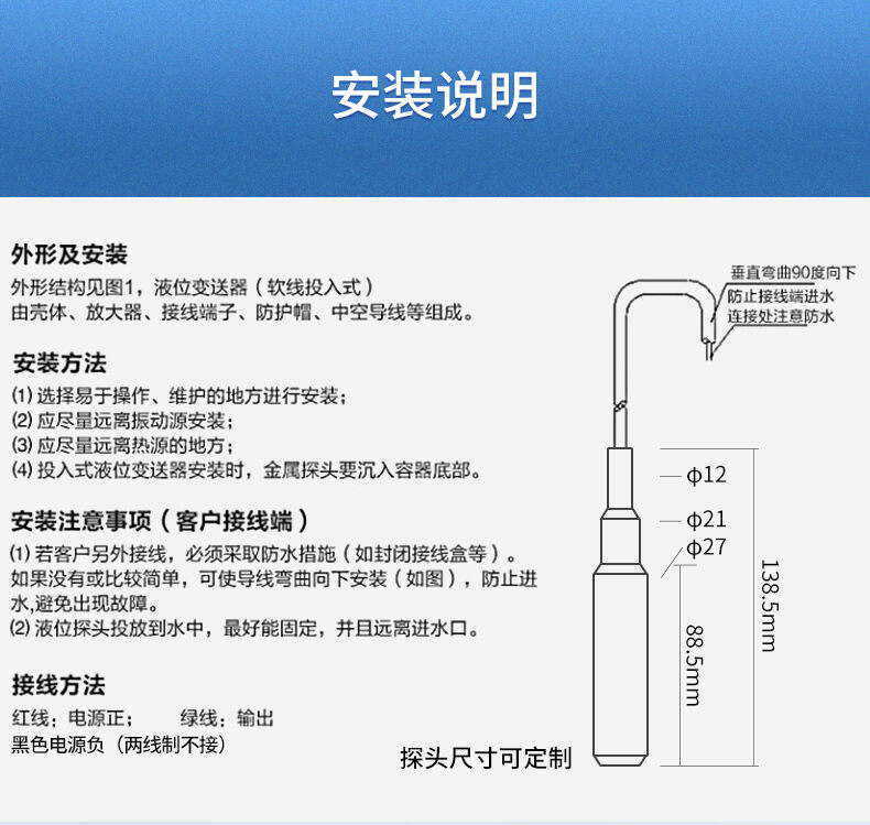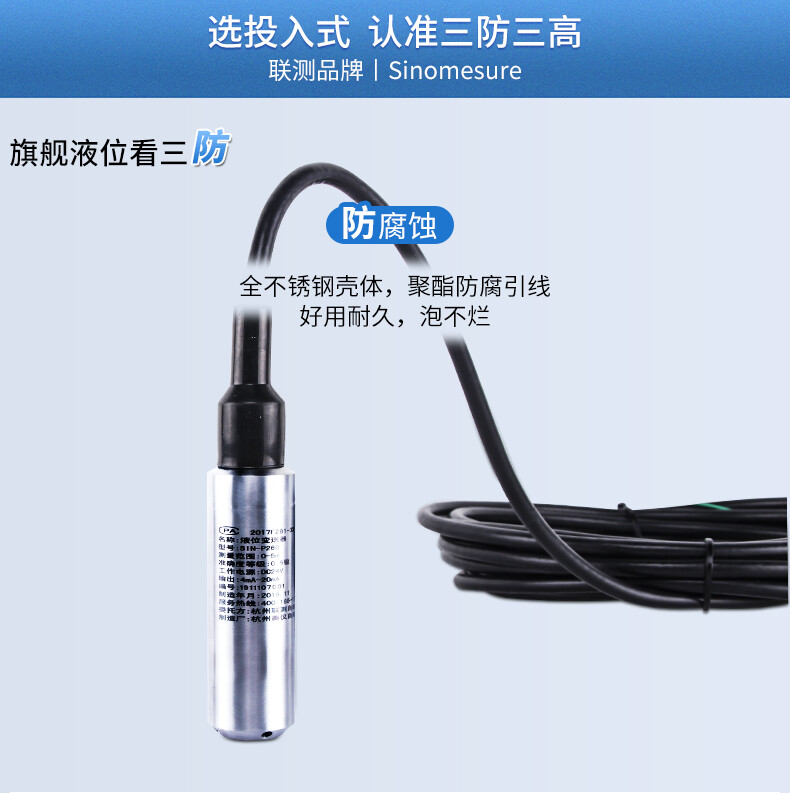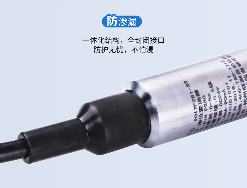 SIN-P260/P2600投入式液位變送器由高性能擴(kuò)散硅壓阻式壓力傳感器作為測(cè)量元件,把與液位深度成正比的液體靜壓力準(zhǔn)確測(cè)量出來,并經(jīng)過信號(hào)調(diào)理電路轉(zhuǎn)換成標(biāo)準(zhǔn)(電流或電壓)信號(hào)輸出,建立起輸出信號(hào)與液體深度的線性對(duì)應(yīng)關(guān)系,實(shí)現(xiàn)對(duì)液體深度的測(cè)量。